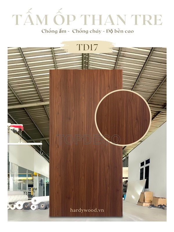 Tấm ốp đa năng/ Tấm ốp than tre TOPDECO là tấm nhựa đặc được dán 1 lớp màng film ở trên bề mặt để tạo vân. Tấm nhựa đặc này có lõi màu đen, bề mặt cứng mịn giúp hạn chế bị lõm khi va đập.