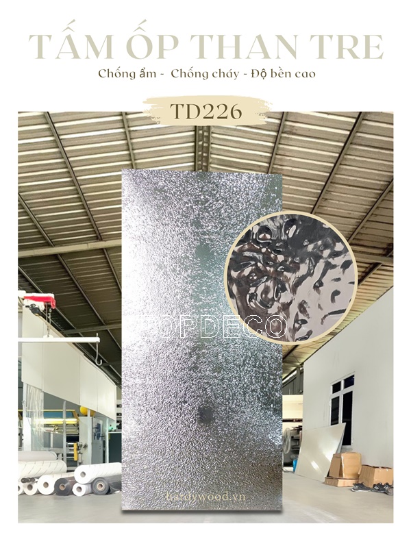 Tấm ốp đa năng/ Tấm ốp than tre TOPDECO là tấm nhựa đặc được dán 1 lớp màng film ở trên bề mặt để tạo vân. Tấm nhựa đặc này có lõi màu đen, bề mặt cứng mịn giúp hạn chế bị lõm khi va đập.