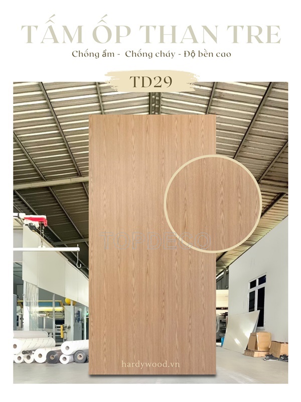 Tấm ốp đa năng/ Tấm ốp than tre TOPDECO là tấm nhựa đặc được dán 1 lớp màng film ở trên bề mặt để tạo vân. Tấm nhựa đặc này có lõi màu đen, bề mặt cứng mịn giúp hạn chế bị lõm khi va đập.